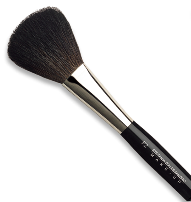 Pennello a manico corto per applicazione di blush, cipria in polvere e fondotinta in polvere compatto; Classica forma bombée appiattita per consentire un duplice uso: di piatto per la stesura del fard sullo zigomo e di taglio per realizzare le ombreggiature sulla guancia.